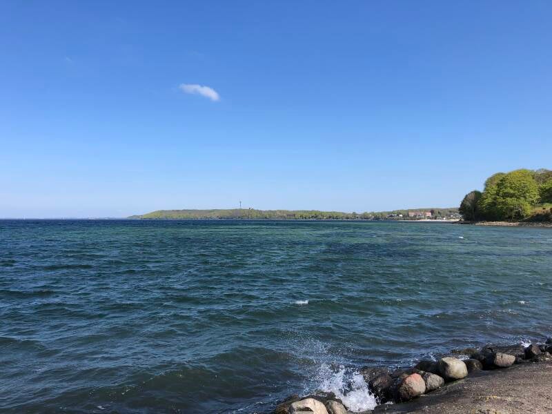 Wir starten in Glücksburg und fahren eine schöne Strecke über Land, durch Felder und kleinere Ortschaften, teils auf Radwegen, teils auf kleinen, wenig befahrenen Straßen. Das Meer ist im Hintergrund fast immer zu sehen. Aufgrund des starken Gegenwindes schaffen wir statt der geplanten 20 nur 16 km im Stundendurchschnitt. Nach 60 km erreichen wir Kappeln und machen eine Pause. Wir würden gerne die Akkus nachladen, aber im Hafengebiet finden wir trotz lebhaften Radverkehrs keine öffentliche Ladestation. Bei einer Etappe von 95 km stoßen unsere Akkus hier schon an Grenzen und wir müssen zeitweise energiesparend ohne oder mit geringer Unterstützung fahren.