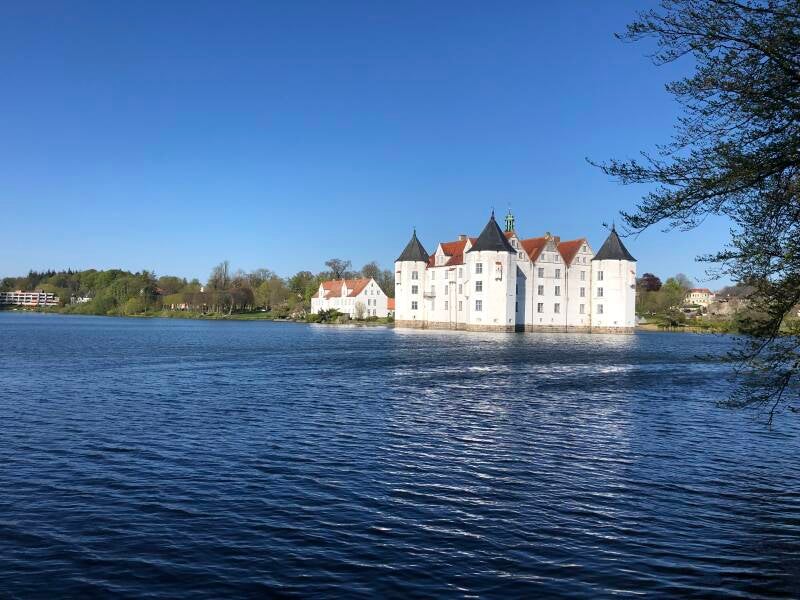Trotz meiner Ängste verläuft die Fahrt relativ entspannt, die Ankunft in Neumünster und das Umsteigen am gleichen Bahnsteig sind so gut getaktet, dass wir einen Zug früher nehmen können. Nach der Ankunft in Flensburg rollen wir gemütlich Richtung Hafen und stärken uns mit einem Backfischbrötchen – das erste von vielen. Dann suchen wir den Einstieg zum Ostsee-Küstenradweg in Richtung Glücksburg – unser erstes Ziel. Der Weg ist gut ausgeschildert und verläuft zunächst bergab, hügelig, später flach Ri. Meer. Die Abfahrt zum Strand Flensburger Förde ist extrem steil – hier lieber die Ausweichstrecke nehmen.