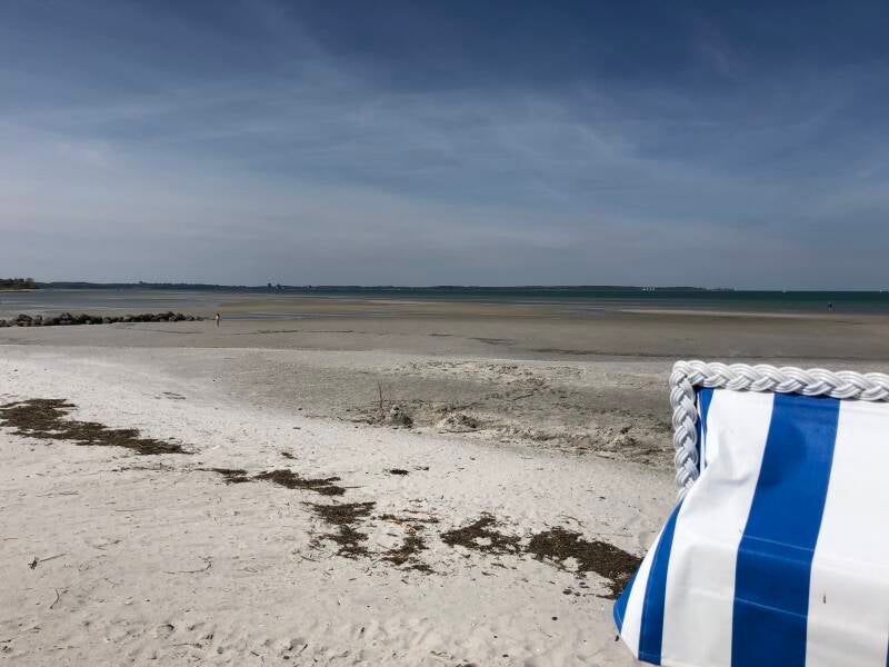 Bei schönstem Wetter ist die Ostsee heute geradezu karibisch grün-blau. Nach dem Ehrenmal bietet sich schon wieder die Möglichkeit einer Rast am Surfcamp mit Liegestühlen und Strandkörben – sehr verführerisch. Und da unsere Etappe dank der Fähre überschaubar ist, gönnen wir uns noch einmal eine halbe Stunde Sonne mit Eis.