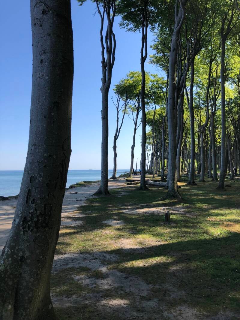Von Kühlungsborn geht es nach dem Frühstück auf dem Deich am Wasser entlang, bei Börgerende beginnt die Steilküste und der Weg führt auf ebenen Waldwegen durch dichten Wald bis zum Gespensterwald – auch einer der Highlights unseres Weges. Bis an die Abbruchkante recken sich bizarr gewachsene Bäume in den Himmel und bewirken eine fast mystische Stimmung. Durch den Wald geht es weiter bis Warnemünde und dort entlang der Promenade zum Hafen in der Stadtmitte. Nach der friedlichen Atmosphäre im Wald erschlagen uns die Menschenmassen fast. Im Hafer ankern zwei Kreuzfahrtschiffe, deren Passagiere sich in den engen Gassen des eigentlich beschaulichen Städtchens drängen.