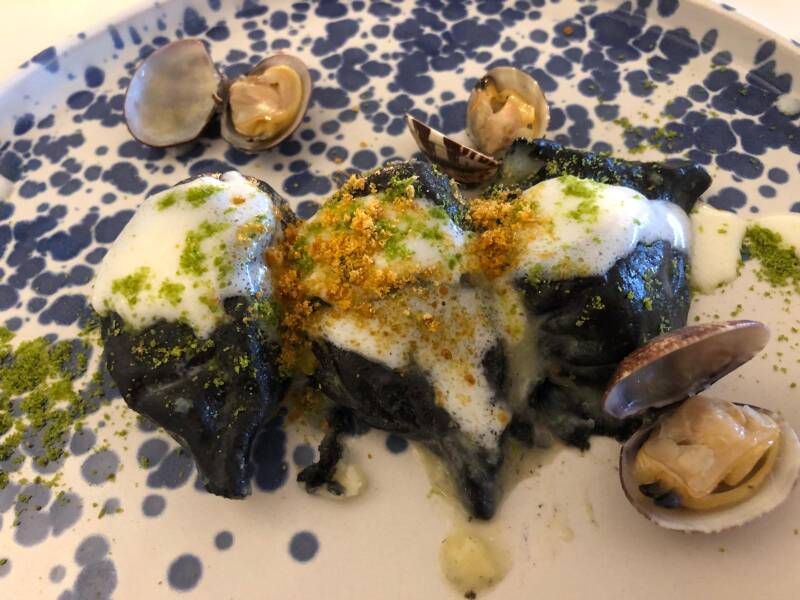Culurgiones mit Tomate, Bottarga und schwarze Culurgiones ebenfalls mit Bottarga