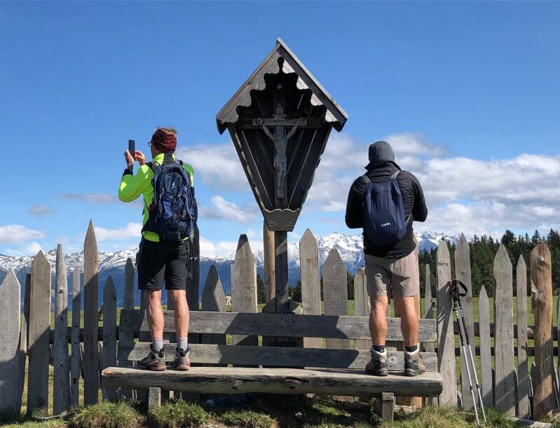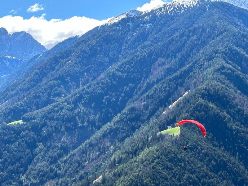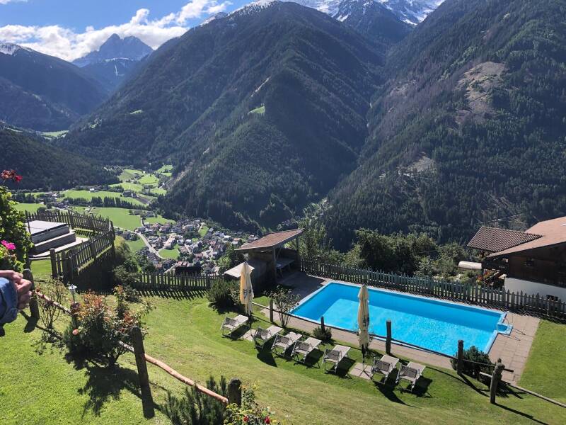 Unser nächstes Quartier ist die Pension Löchlerhof auf ca. 1300m Höhe, über eine steile Serpentinenstrecke zu erreichen. Der Hof liegt malerisch am Berg, von der Terrasse schaut mal über den Garten mit Pool auf Lüsen, neben uns schweben Gleitschirmflieger ins Tal. Begrüßt werden wir mit einem Cocktail und strecken die Beine in die Sonne. Nach dem Einchecken und dem Rundgang durch den Wellnessbereich wandern wir bergauf zum Absprungpunkt der Gleitschirmflieger, die leider zum Zeitpunkt unserer dortigen Brotzeit ihre Sprünge schon eingestellt haben.