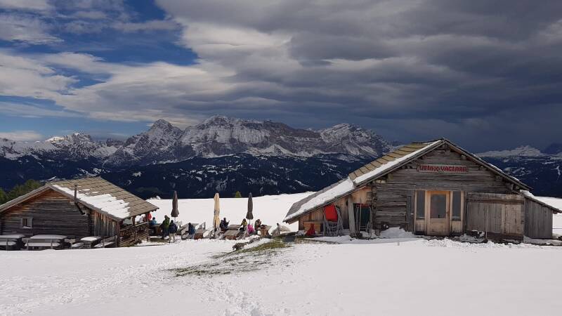 Um nicht fahren zu müssen, wandern wir heute von der Hütte auf das Skigebiet Plose oberhalb von Brixen. Unser Ziel ist die Roßalm. Wir laufen über Weiden und durch dichten Wald aufwärts und erreichen nach ca. 3 Stunden die angeblich schönste (und mondänste) Hütte Südtirols mitten in einem Skigebiet. Da die Hütte auch mit einer Seilbahn erreicht werden kann und oberhalb eines exklusiven Hotelresorts liegt, ist sie gut gefüllt mit Menschen, die nur den kurzen Weg von der Mittelstation der Bahn zurückgelegt haben – aber immerhin zünftig in Wanderbekleidung.