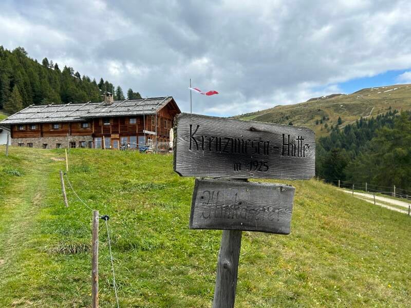 Die Kreuzwiesenalm ist gut besucht, besonders von Familien mit kleinen Kindern. Sie ist bekannt für ihren eigenen Käse, was wir umgehend testen, bevor wir dem Tipp unseres knieversehrten Informanten in Lüsen nachkommen und den Kaiserschmarren bestellen.