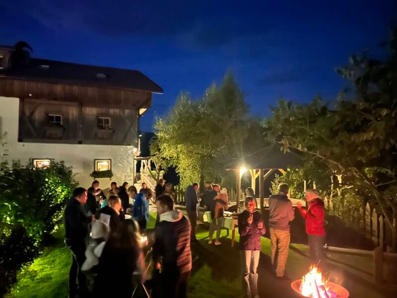 Zum Nachtisch und Ausklang treffen wir uns im Garten stimmungsvoll um eine Feuerschale zu gerösteten Kastanien, verschiedenen Krapfen und Glühwein.
