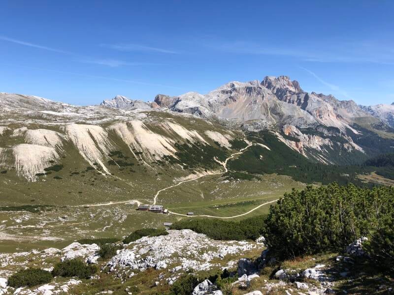 Nach einer Übernachtung in St Vigil starten wir an einem sommerlichen Montagmorgen über die gebührenpflichtige Bergstraße durch das Rautal zum Parkplatz des Rifugio Pederü im Zentrum des Naturparks Fanes – Sennes – Prags. Wir schultern unsere Rucksäcke und wandern bergaufwärts nach Norden zu unserem diesjährigen Stützpunkt, dem Rifugio Sennes. In zwei Stunden steigen wir von 1548m auf eine Höhe von 2126m – zunächst steil bergauf auf einer schmalen Fahrstraße, später im Zickzack durch immer lichter werdenden Wald, bis zu einer weiten Hochebene, an deren Ende unsere Hütte liegt.