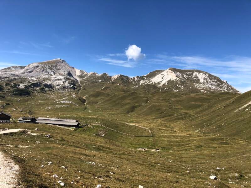 Die Vorschau zeigt uns, dass es einen Wetterwechsel geben und es im Lauf des Tages regnen wird. Also nutzen wir den Vormittag, möglichst weit zu laufen und starten erneut Ri. Foses See, von wo wir mit Blick auf die Rote Wand – Remeda Rosses - ca. 400 Höhenmeter zum Cianpo de Crosc, ein weites schönes Tal, hinabsteigen. Vom Tal aus geht es wieder stetig aufwärts und langsam beginnt es zu regnen. Bei der Ankunft an unserem Etappenziel – der Schutzhütte Fodara Vedla sind wir trotz der Regenjacken bis auf die Haut durchnässt und von starkem Wind ausgefroren. Anlass, uns mit heißen Getränken und Suppen wieder aufzuwärmen und zu hoffen, dass die Oberkleidung zumindest antrocknet.